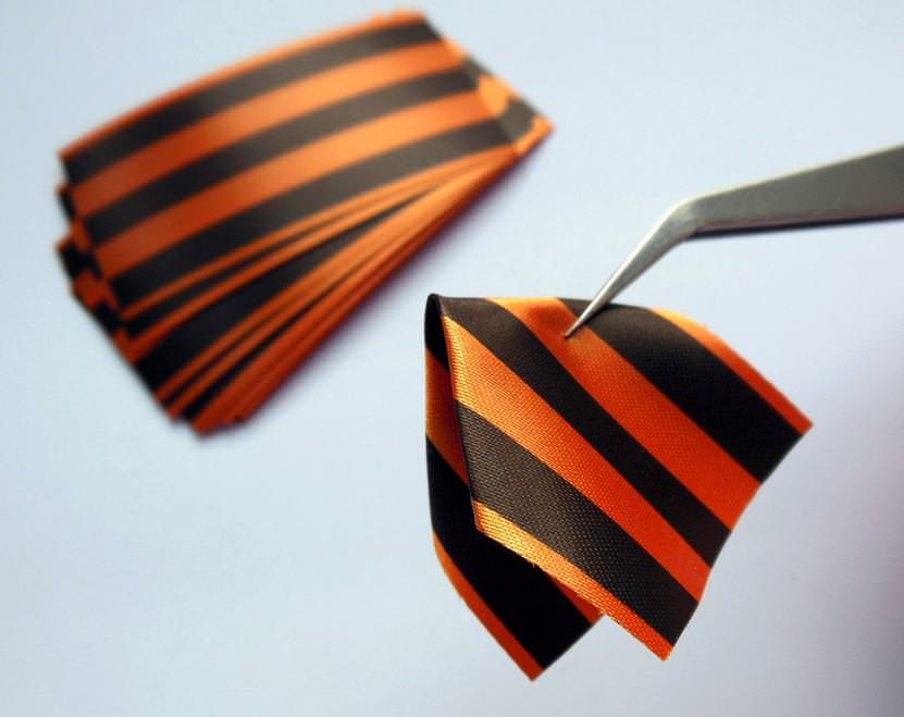 Если у вас нет готовой ленты, соберите знак Георгия Победоносца самостоятельно. Для этого поочередно приклейте друг к другу ребра атласных ленточек. Здесь пригодиться клеевой пистолет: он способен выдавать тонкую линию клея по кромке атласа. Дайте ленте высохнуть 30–40 минут, после чего прогладьте утюгом с использованием пара.