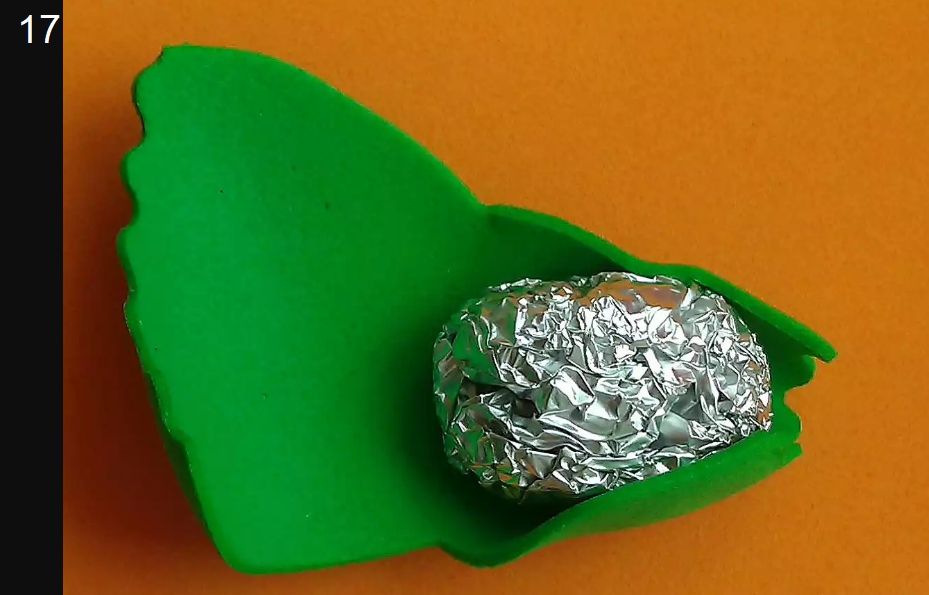 11. Сформируйте чашелистник. Для этого сделайте шарик из фольги, вложите в чашелистник, приклейте. Наденьте на стебель, подтяните к цветку и приклейте.