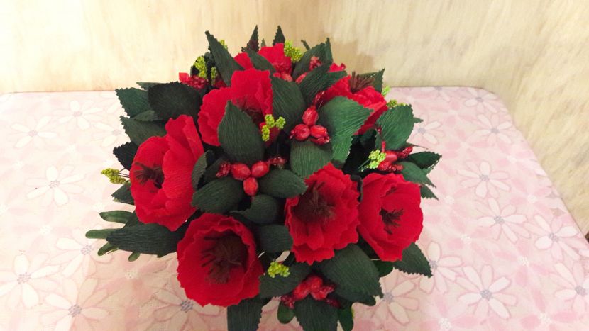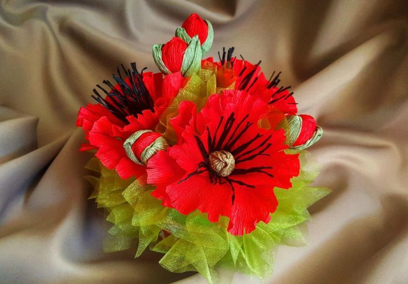 Расправляем края, имитируя лепестки мака. Таким же образом, формируем остальные 6 цветков. Свежеиспеченные маки фиксируем тейп-лентой на шпажке. Для эстетики среди цветков просовываем беспорядочно зелень. Букет оборачиваем сеточкой и завязываем бантик.