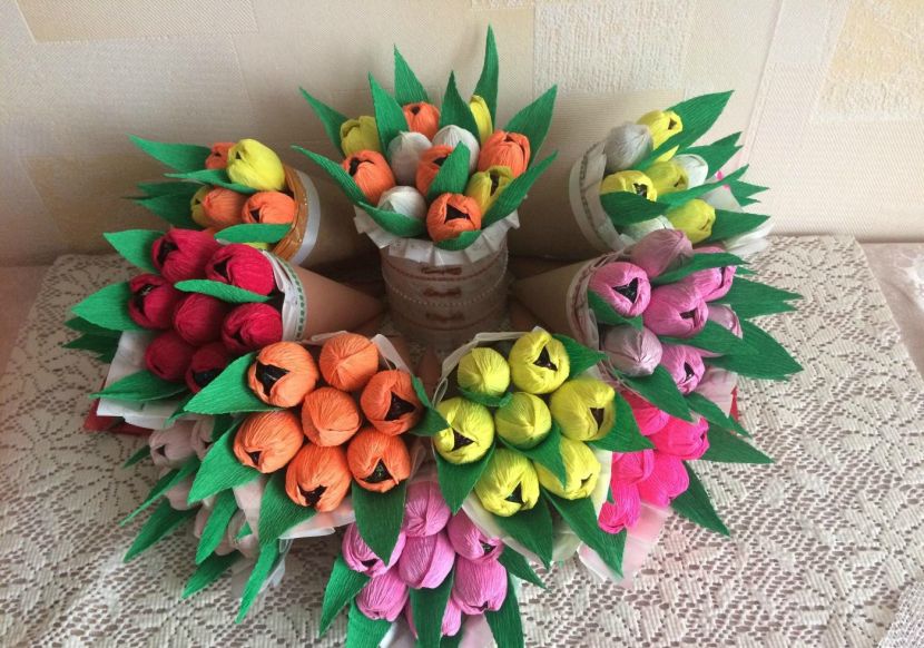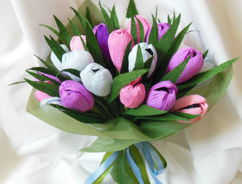 Цветы для букетов из конфет чаще всего делают из гофрированной бумаги, которая прекрасно держит форму и легко гнется в форме лепестков