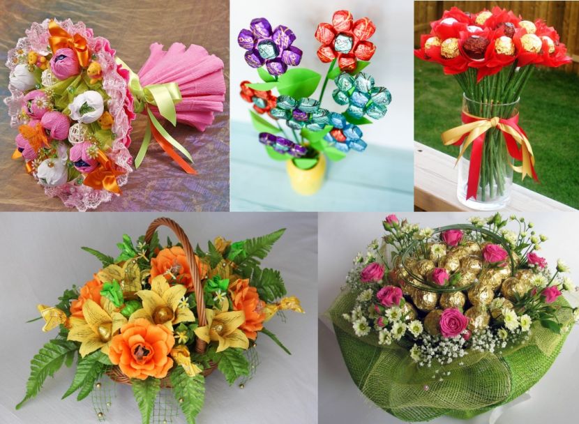Такой сюрприз покорит сердце любой женщины, начиная с детсадовского возраста. Если вы не знаете, что дарить на предстоящий праздник представительнице слабого пола, смело подхватывайте идею. Сладкий цветочный букет в превосходном исполнении покорит даже самое холодное сердце. Итак, рассмотрим некоторые варианты.