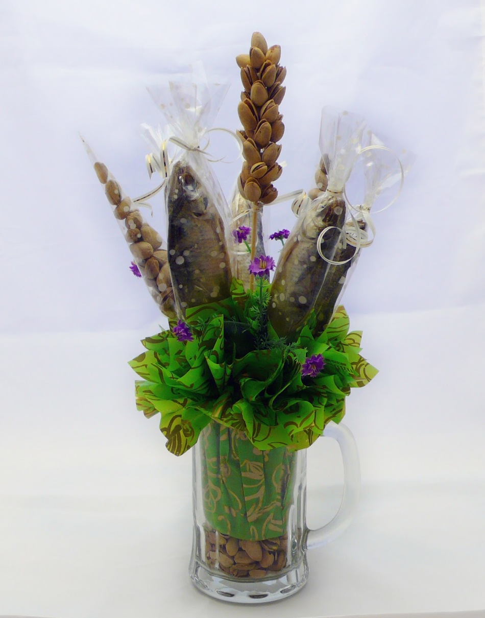 Если мужчина любит время от времени побаловать себя пенным напитком, великолепным подарком станет букет из пива и рыбы. Можно просто завернуть рыбу в сложенную в виде упаковки газету и перевязать её лентой. Банки же пива можно аккуратно сложить в виде торта.