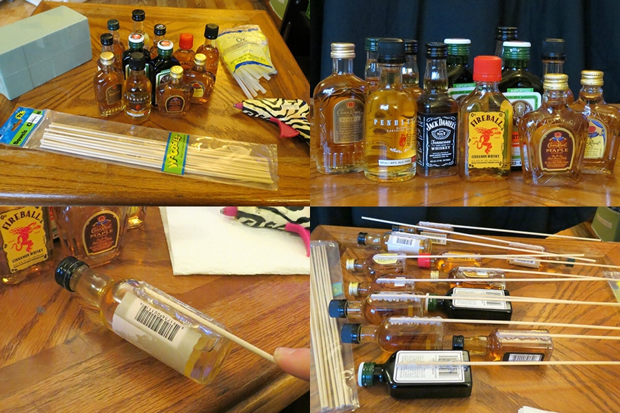 - Сначала нужно к нескольким (не больше 5 штук, чтобы не «перенасыщать» букет) сувенирным маленьким бутылочкам с алкоголем «посадить» на клей деревянные палочки (для этого можно использовать клеевой пистолет).