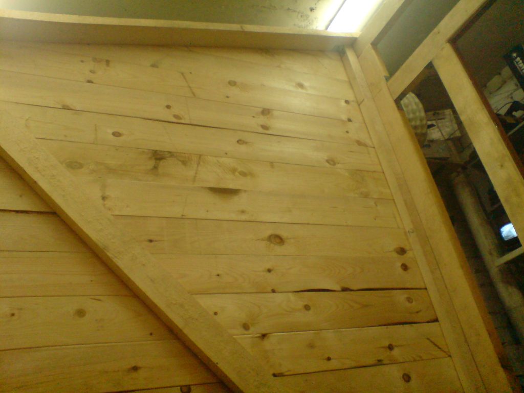 - Внутренняя обшивка стен и потолка листовыми материалами (ДВП, ДСП, ОСП, фанера) или вагонкой.Установка перегородок из бруса 50х50 с креплением к полу, потолку и стенам, обшивка их листовым материалом.