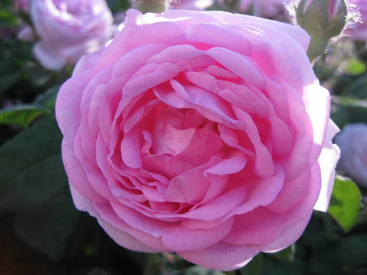 - Парад. Цветок махровый, ярко-розового цвета с ненавязчивым ароматом. Плетущийся кустарник занимает большую площадь.