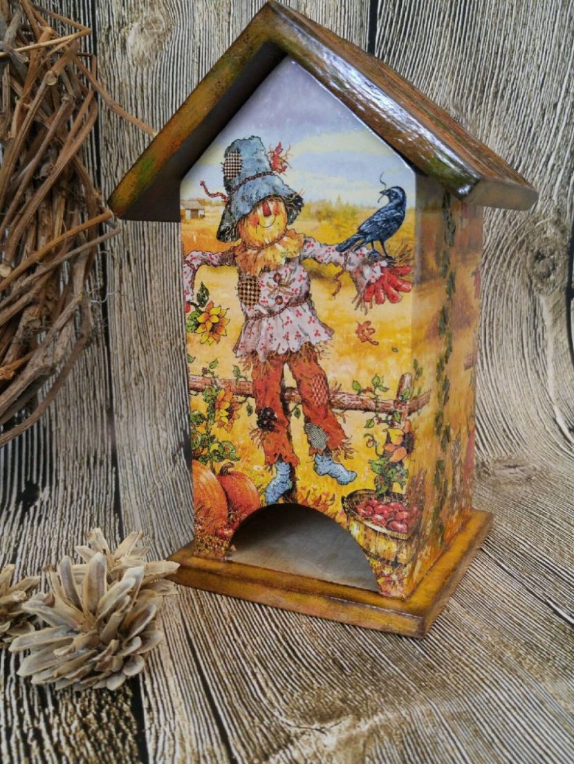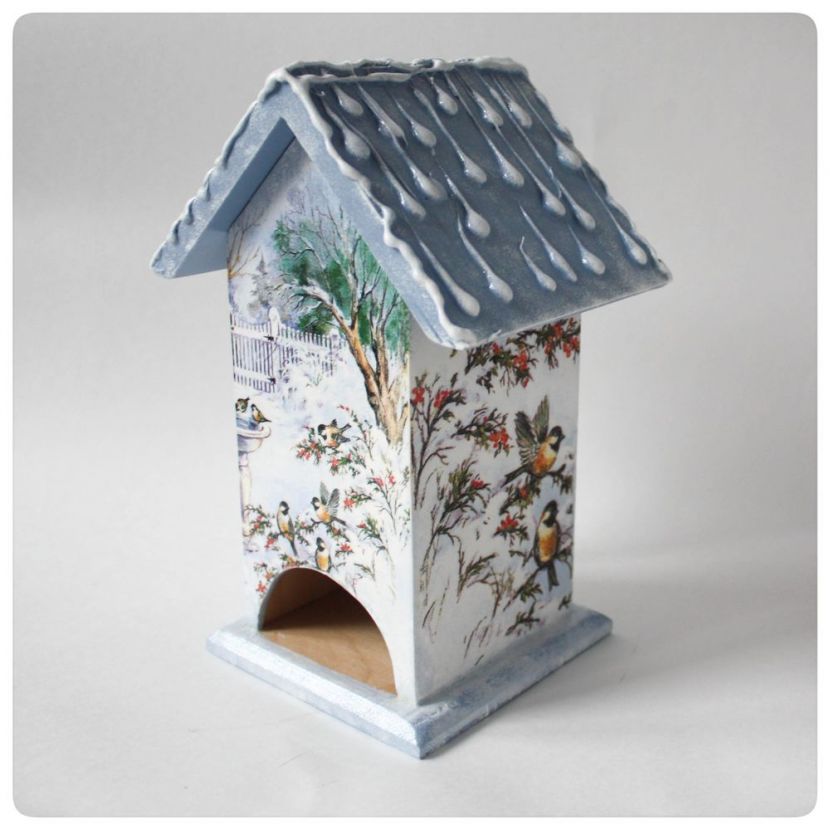 Вырезаем (а лучше — вырываем) из салфеточки нужные элементы, приклеиваем с помощью клея ПВА. Покрываем лаком весь домик.