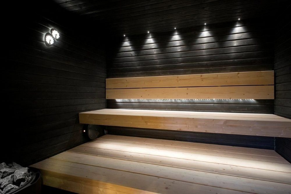 Важную роль играет правильно подобранное освещение. В парной выбирают неяркий, приглушенный свет – это позволяет создать расслабляющую атмосферу. Можно использовать встроенные точечные светильники на подшивном потолке или диодную подсветку. Спектр света должен быть мягким желтым. Следует учесть, что к светильникам в бане предъявляются особые требования – плафоны должны быть изготовлены и термостойкого и устойчивого к влаге материала. В комнате отдыха светильники–бра можно расположить на стенах.