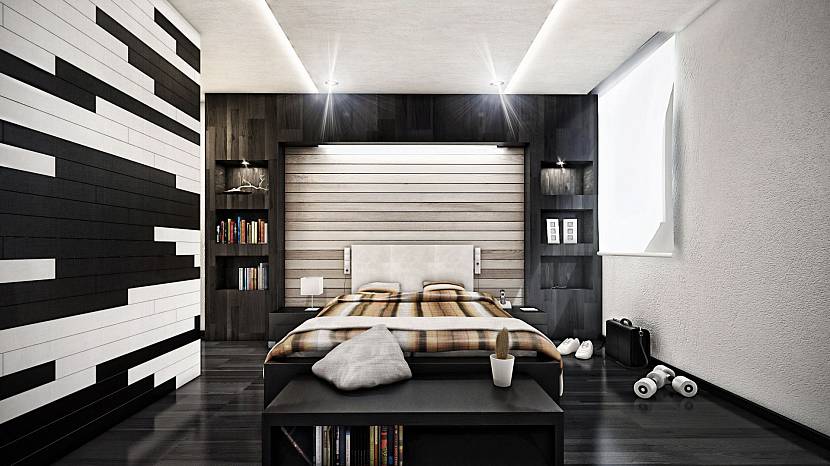 Стильными обоями противоположных цветов, изысканно и оригинально будет смотреться и мужская спальня. Тут хорошо выглядит сочетание участков с доминированием черного цвета и полей, в которых преобладает белый цвет. Подобная комната выглядит одновременно и строго, и роскошно.