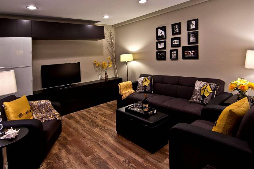 Интерьер с черным и коричневым оформлением в залеИсточник domoholic.ru