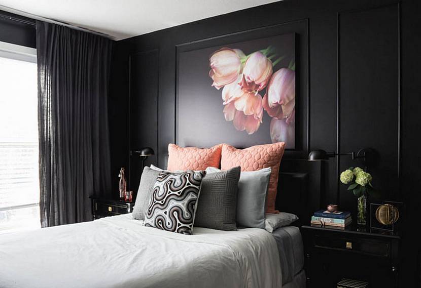 Черные стены с ярким акцентом приобретают не только динамику и структуру.