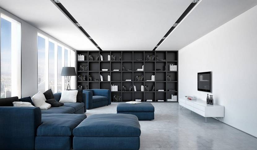 Интерьер в черно-синем оттенке в гостинойИсточник design-homes.ru
