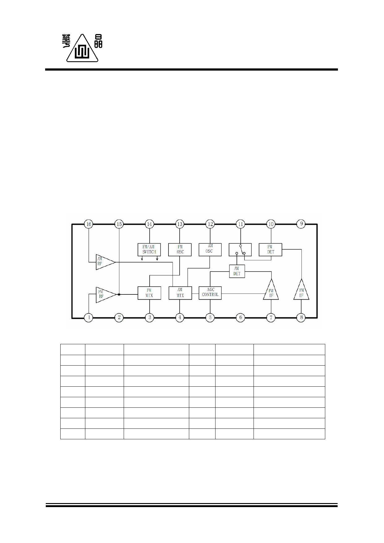 CD2003GP/GB 1、 Overvie w The CD2003GP/GB is a monolithic IC ● No need for FM IFT, AM IFT, and FM detector coil ● Adjustment free for FM detector circuit ● Wide operating supply voltage range: VCC=1.8~7V (Tamb=25℃ ) ● Package: DIP16/SOP16 2、 Block Diagram And Pin Descriptions 2. 1. Block Diagram 1 INFMR 2 GNDIN 3 OUTFMM 4 OUTAMM 5 AGC 6 VCC 7 INAMI 8 INFMI Function 9 GNDOUT Output Ground 10 QUAD 11 OUTDET Detector Output 12 OSCAM AM Oscillation 13 OSCFM FM Oscillation 15 TUNFM 16 INAMR FM Tuner Version:2008-07-A WUXI CHINA RESOURCES SEMICO CO.,LTD. Page: 1/7