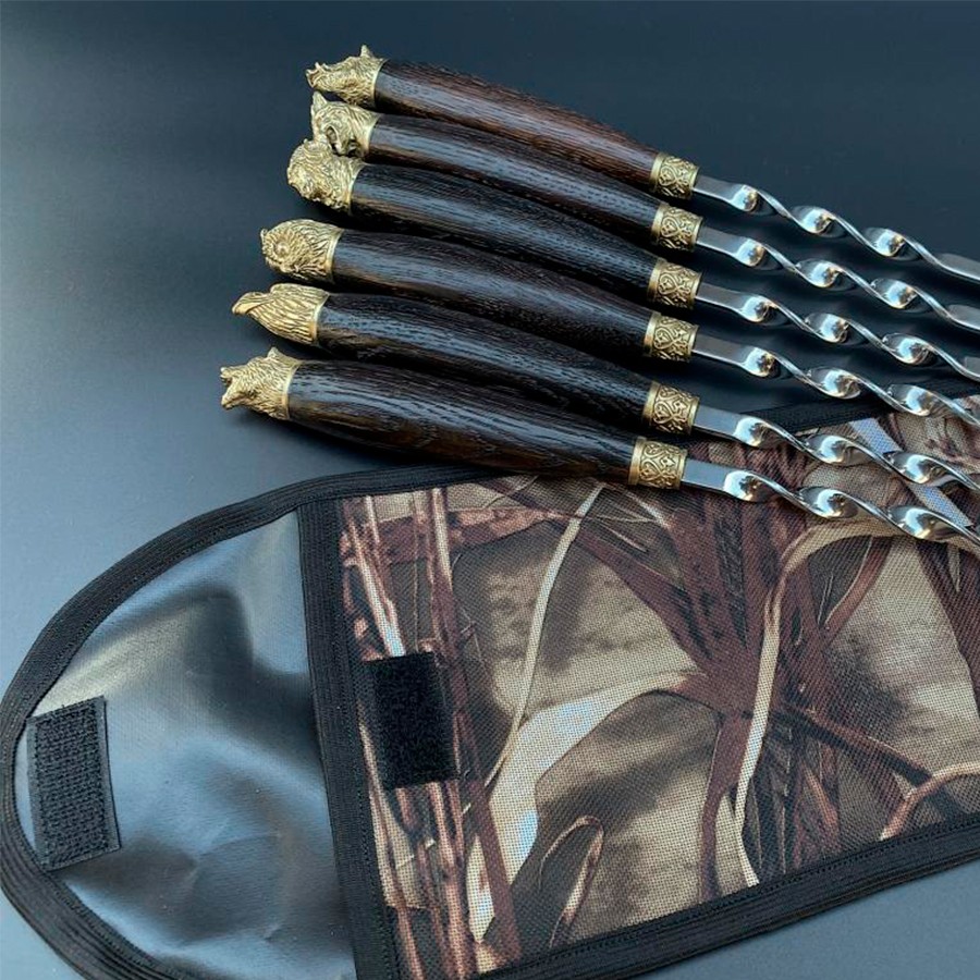 Для ручек шампуров, уместно использовать древесину лиственных пород с тонковолокнистой структурой. В приоритете решения из лиственницы, дуба, акации. Накладки полукруглой или плоской конфигурации крепятся к металлической основе с помощью болтов или же фиксируются заклепками. Для прочности конструкцию уплотняют кольцами из цветного металла.