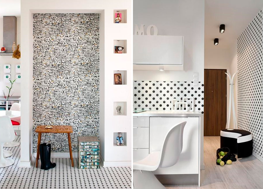 Если вы украшаете стены других комнат необычными обоями с узором, то не стоит обделять таким украшением и прихожую. Это подчеркнет последовательность дизайна интерьера квартиры. Только не следует клеить такие обои на все стены коридора. Используя смелые графические узоры, стоит сбалансировать интерьер нейтральным белым или серым цветом.