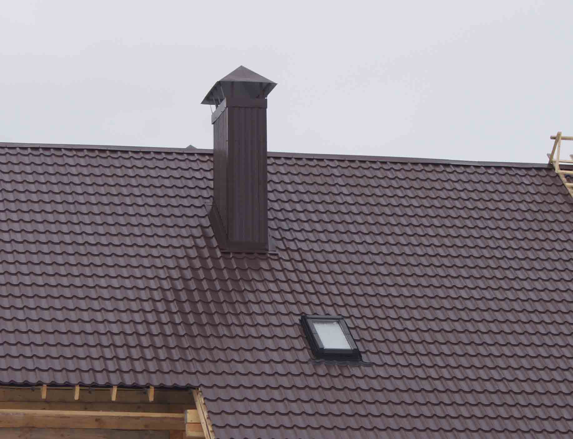 - Основание дымовой трубы фиксируют на профильной крыше с помощью шурупов.