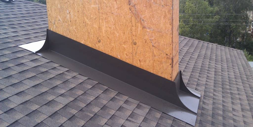 Для защиты от воды на трубу дымохода надевают жестяной фартук с параметрами, аналогичными габаритам трубы. Верхнюю часть покрытия фиксируют к вертикальной конструкции, обжимают хомутами и герметизируют. Нижнюю часть фартука устанавливают на крыше поверх кровельной обшивки и фиксируют саморезами.