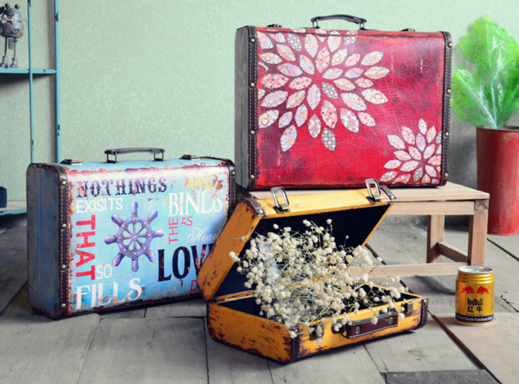 Винтаж – воссоздание модных тенденций давно минувшего времени. Стиль требует использования эффектов состаривания. Цветовая гамма – ровная, применяется несколько близких тонов, либо контраст двух – темного и светлого. Винтажный декор чемодана особенно уместен в путешествиях.