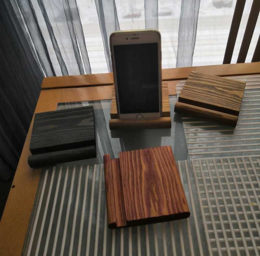 Готовую подставку для телефона можно покрасить и нанести с помощью лазера или выжигателя логотип — способ превратить изделие в авторское произведение искусства.