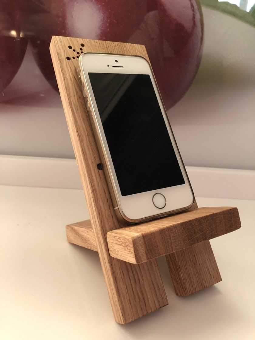 Также нужно вырезать небольшой кусок дерева, который будет удерживать смартфон. Он тоже клеится к корпусу. Подставка для телефона из дерева, сделанная своими руками, готова! Завершающий этап. После шлифовки подставку под смартфон следует покрыть лаком.