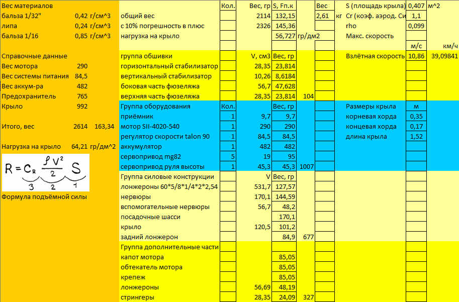 Если вес самолёта окажется избыточным, то увеличится площадь крыла, а конструкцию самолёта нужно будет пересматривать. В дополнение на этом этапе нужно будет оценить, насколько быстро модель будет набирать взлетную скорость. Для этого используйте уравнение подъемной силы, приведенное на рисунке и в таблице, и подставьте в него значения аэродинамического коэффициента максимальное для вашего профиля, либо консервативное значение равное 1,1.