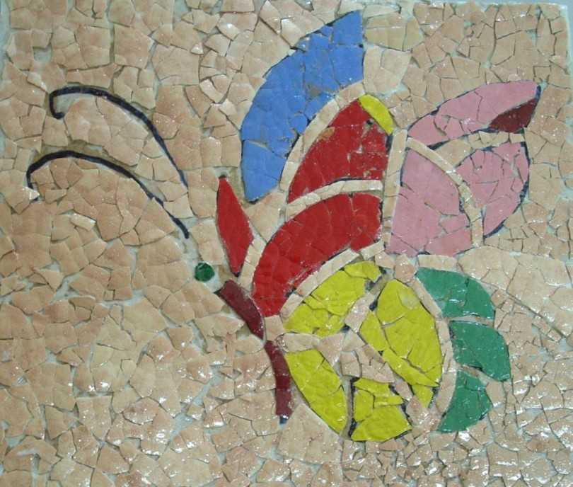 Далее на панно, пользуясь трафаретом, или от руки наносят контуры задуманного рисунка, дважды обводят их гуашью или тушью и приклеивают цветные осколки, подходящие по цвету. На область фона наклеивают прозрачные осколки и дают изделию высохнуть.