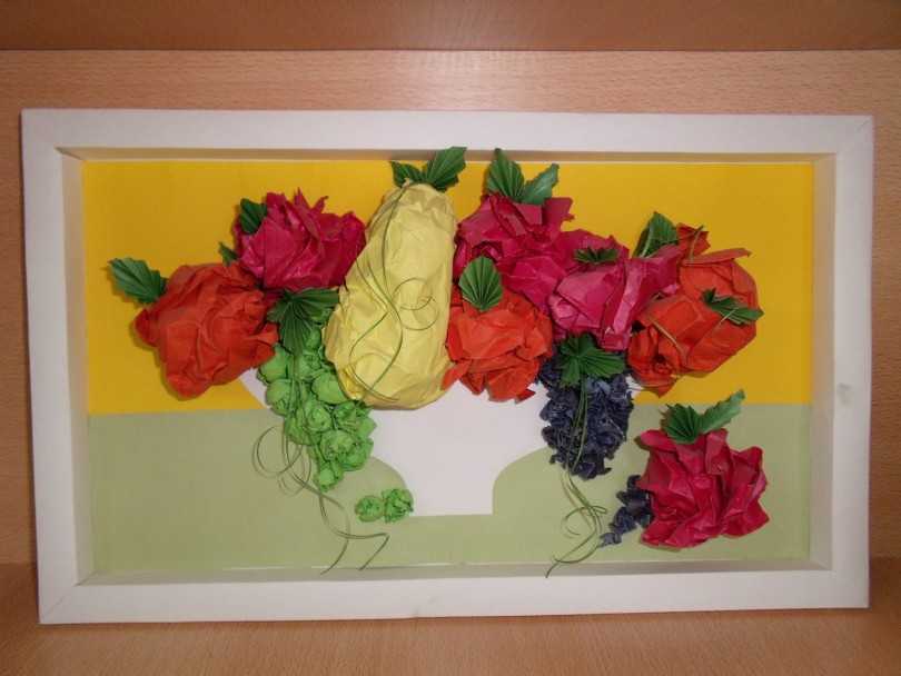 Также оригинально будут смотреться фрукты из бумажных розеток. Для поделки нужно вырезать из бумаги полоски, шириной 4,5 см и длиной 18 (2 шт.), 23 (4 шт.), 28 (4 шт.) сантиметров. Сложить из полосок гармошки, парные склеить. Сформировать из склеенных полосок круги, склеить в розетки.