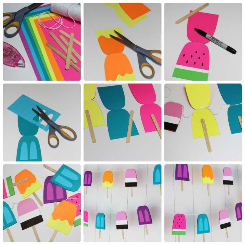 С этой работой справятся детки из средней дошкольной группы, либо младшие дошкольники под руководством взрослых. Полученные фигурки сложить попарно, между ними проложить веревку, склеить. Дети младшего возраста могут украсить фигурки дополнительными деталями из самоклеящейся бумаги: на бабочек можно приклеить цветные пятнышки, на ёлочки — новогодние шарики. Детям нравится украшать детали гирлянды в произвольном порядке, а взрослым нравится конечный результат.