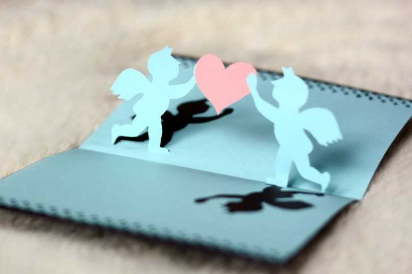 Вырезанную заготовку аккуратно складывают, чтобы получилось симметрично, склеивают 3 части, оставляя свободным верхний уголок.