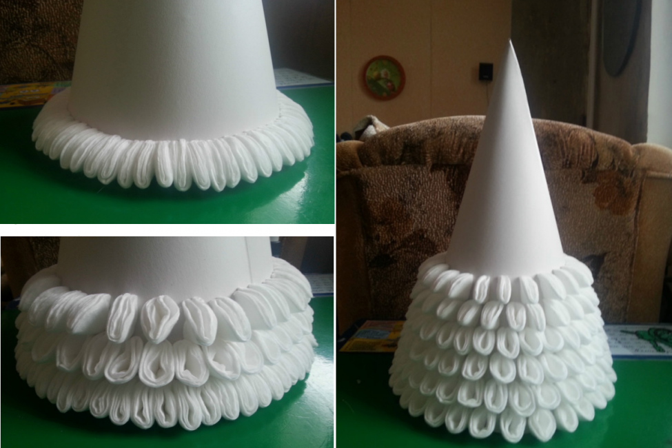 Такую процедуру проделываем со всеми ватными дисками, потребуется терпение и достаточное количество времени. Когда все будет готово, прикрепляем ватные заготовки к картонному конусу.
