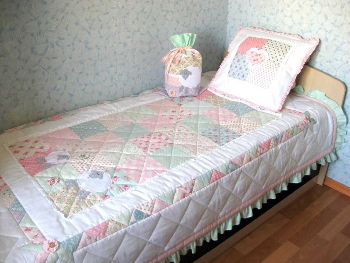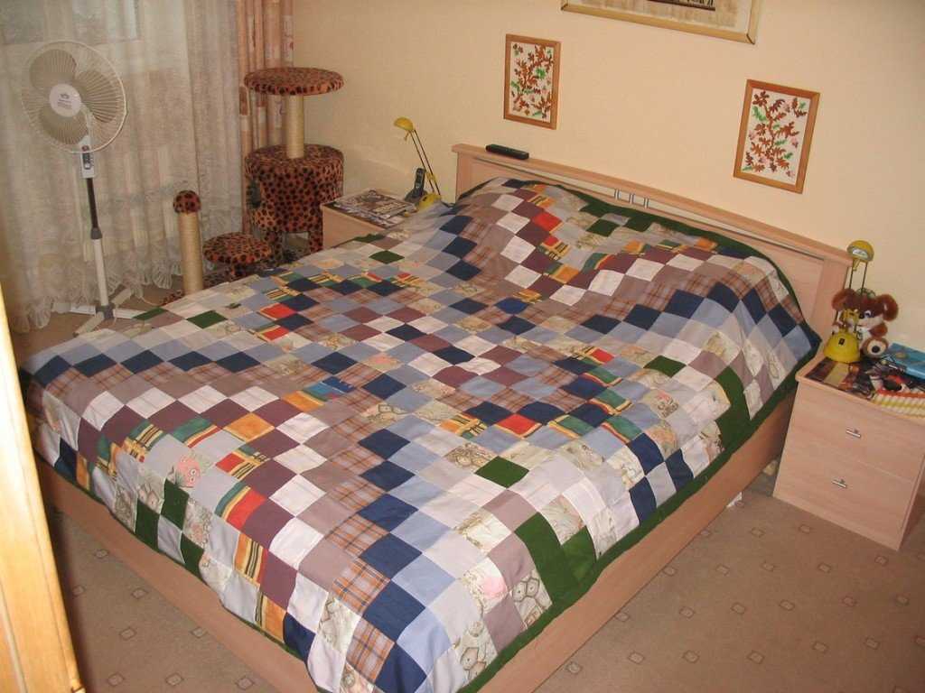 Сшить лоскутное покрывало можно из достаточно больших кусков ткани, которые легче сшить между собой, чем мелкие детали для кухонной прихватки или декоративной подушки, к примеру.