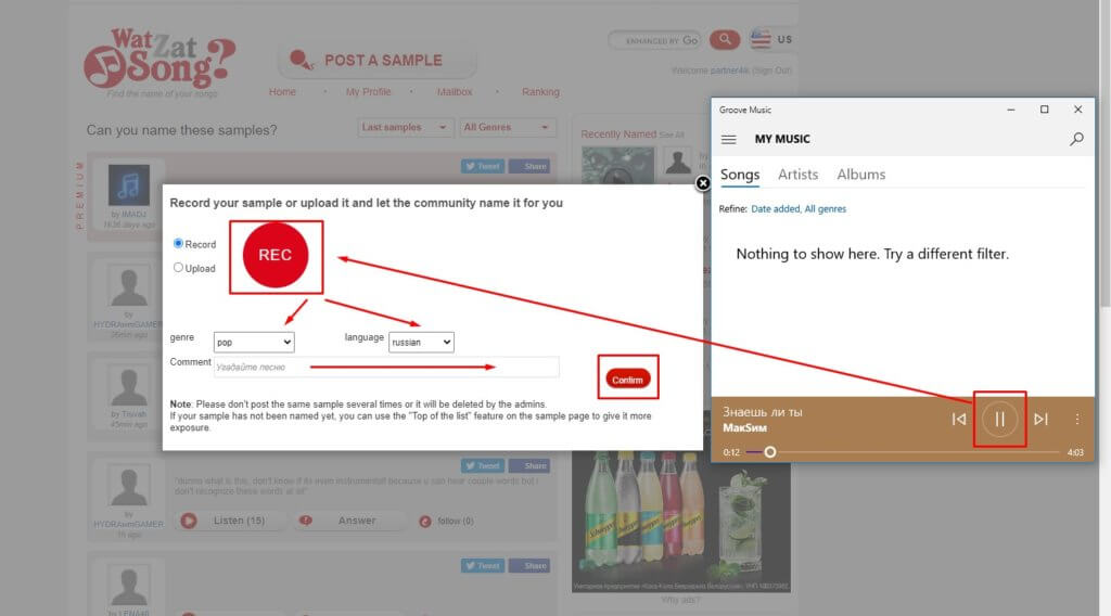 На следующей странице нажмите кнопку «Record» и включите музыку на компьютере или другом устройстве. Дав сервису как можно больше времени на прослушивание, нажмите кнопку «Stop», и онлайн-сервис отобразит результат поиска.