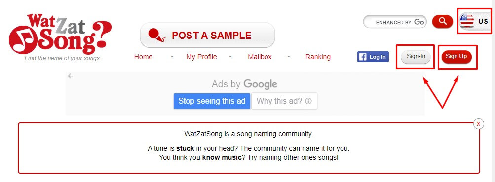 Во-первых, надо зарегистрироваться. Чтобы сделать это, нажмите «Sign Up» справа. Теперь с помощью функции «Post a Sample» вы можете пропеть, напеть или проговорить искомую песню на вашу веб-камеру. Кроме того, фрагмент можно загрузить в формате MP3.