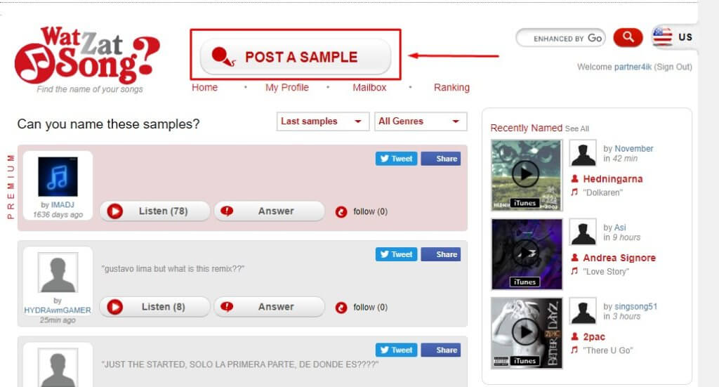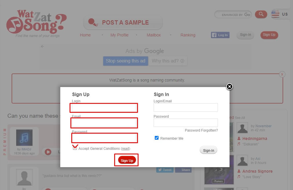 Во-первых, надо зарегистрироваться. Чтобы сделать это, нажмите «Sign Up» справа. Теперь с помощью функции «Post a Sample» вы можете пропеть, напеть или проговорить искомую песню на вашу веб-камеру. Кроме того, фрагмент можно загрузить в формате MP3.
