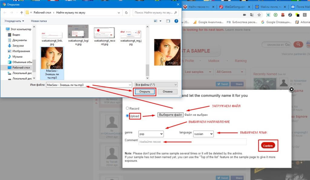 На форуме, можно узнать что за песня находится на компьютере. Для этого, необходимо выбрать режим «Upload» и указать путь нахождения трека. После оформления, необходимо нажать «Confirm».