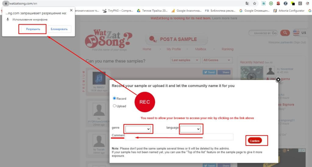 После разрешения сервису использовать микрофон, необходимо оформить пост. Указать жанр музыки, язык исполнения и написать комментарий для тех, кто будет определять музыку.
