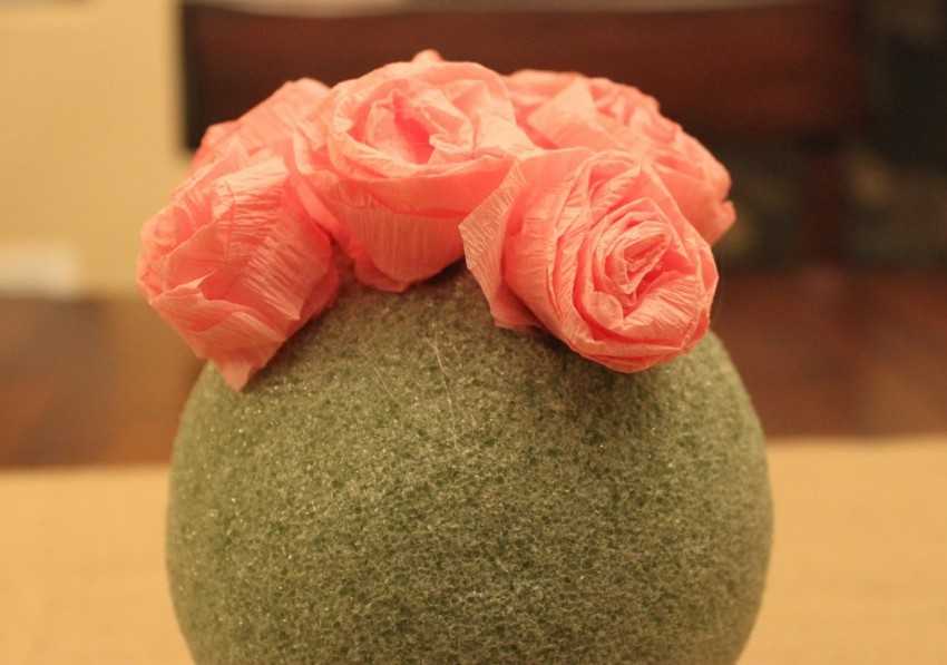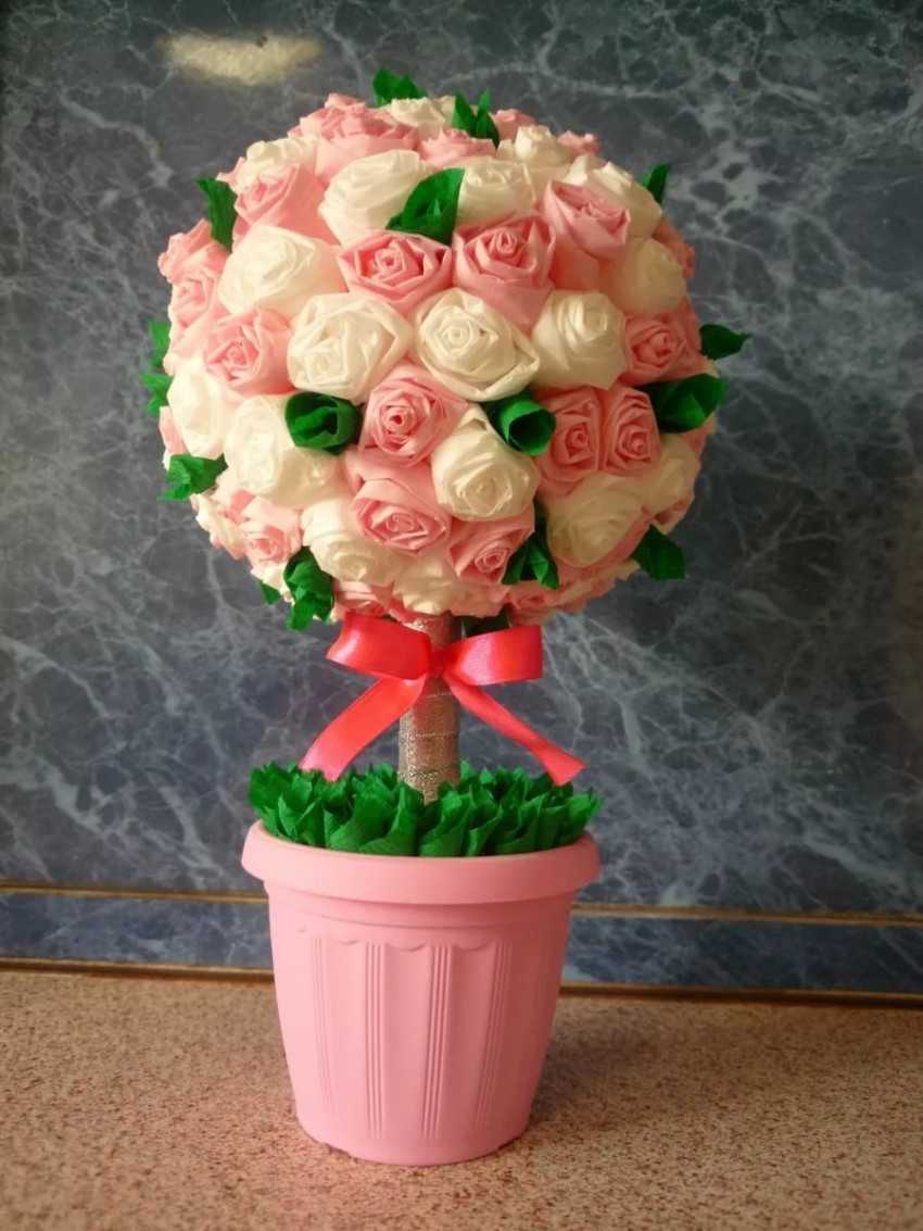 Это необычное украшение определенно заслужит внимание окружающих. Достаточно ознакомиться пошаговой инструкцией розы из салфетки своими руками для небольшого дерева – топиария: