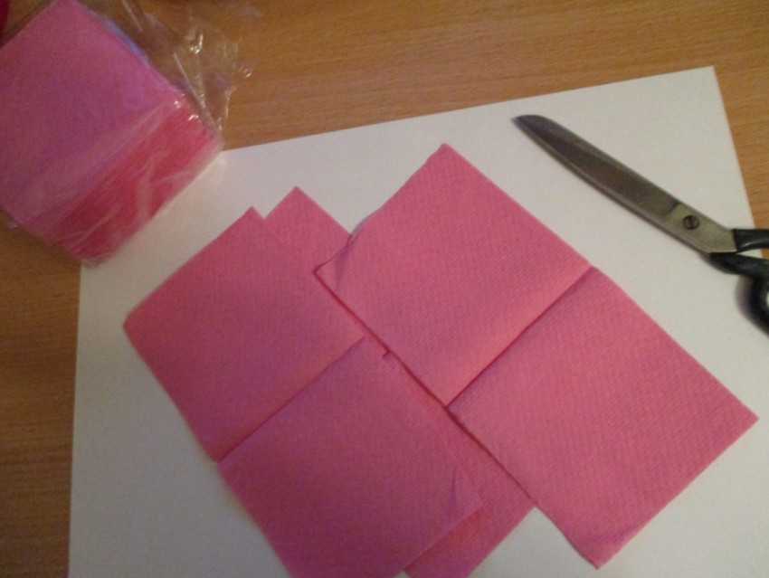 Потребуется взять несколько салфеток. Их нужно разрезать пополам, сформировав квадратные бумажные детали.