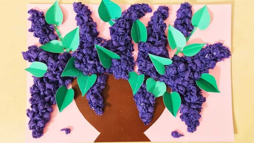 Май, время красоты. Последний месяц весны радует нас своим цветением. Именно поэтому мы решили создать работу посвящённую дереву сирень. Перед началом работы, дети познакомились с растением. Рассмотрели живую ветку сирени, смогли её потрогать, почувствовать её запах….