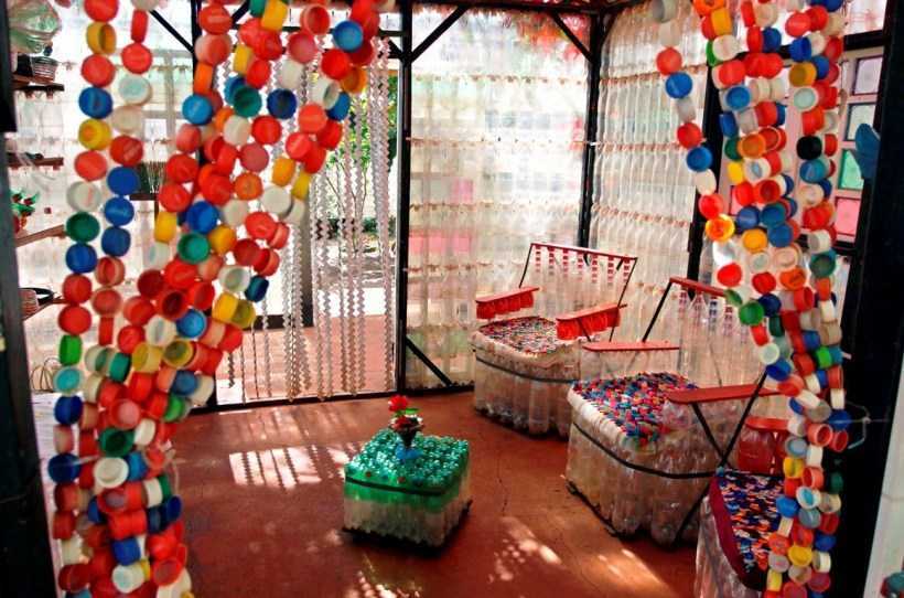 Умельцы из такого доступного материала, как пластиковые бутылки способны творить удивительные вещи, создавая, например, полноценную зону отдыха. Стены, занавески для летней беседки делают, как из этого материала, а также используют разноцветные крышки.