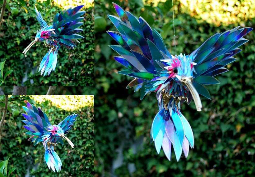 Маленьким огородным пугалом может стать миниатюрная сова из диска и фольги, а наиболее простой декор для беседки можно изготовить следующим образом. Обклеить диск бусинками, морскими раковинами и камнями, привязать к нему шнурки с грузиками, которые будут симпатично покачиваться на ветру.