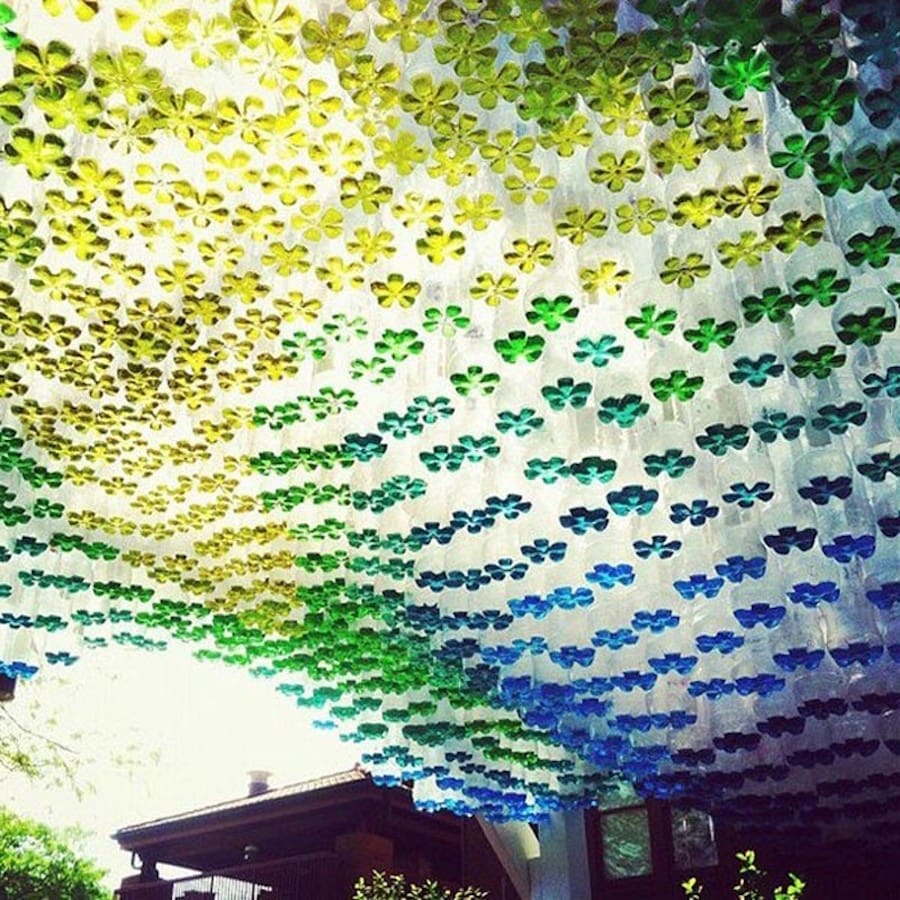 Собрав необходимое количество пластиковых бутылок, можно соорудить удивительный по декору навес, служащий укрытием для автомобиля. По такой же технологии делают уголок отдыха, разместив под сверкающим на солнце пологом легкую плетеную мебель.