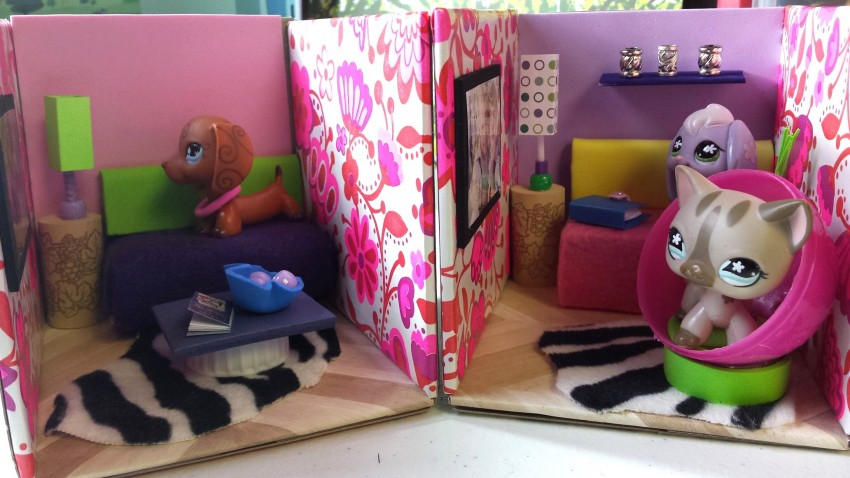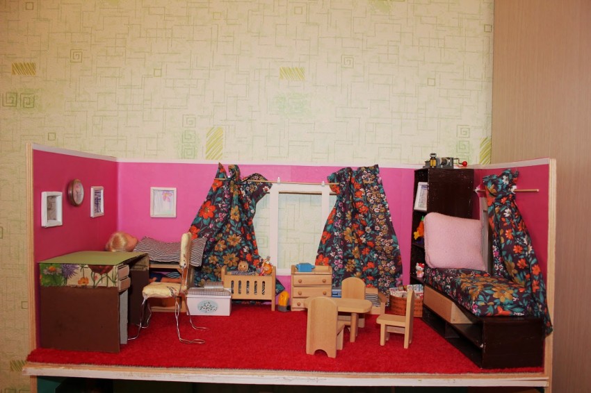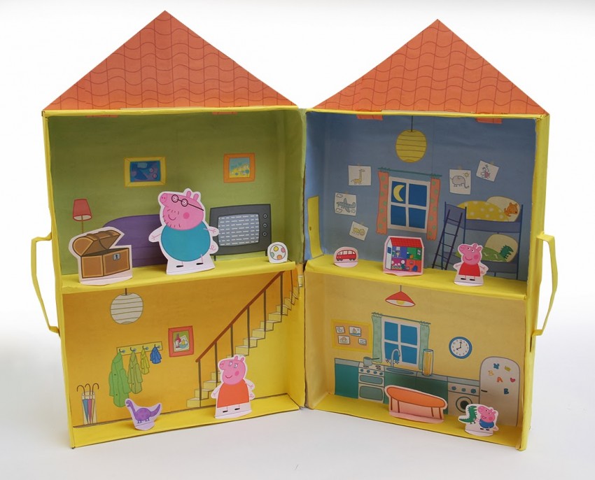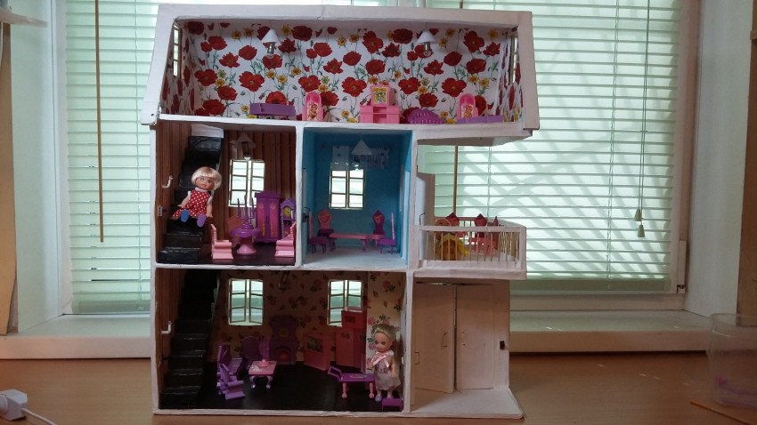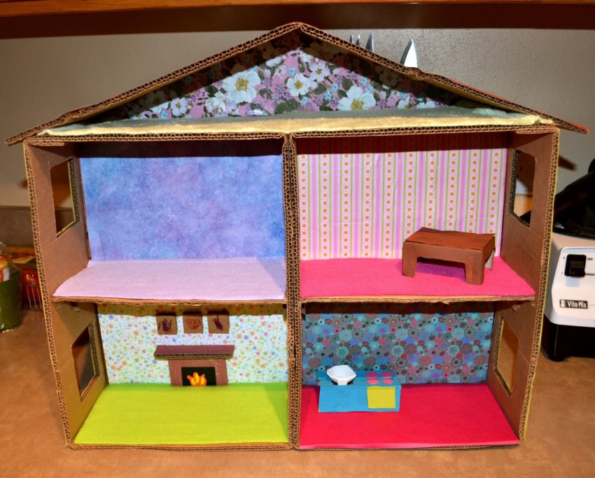 После того, как конструкция дома готова, можно приступать к декору. Здесь от вас потребуется только техническая помощь, ведь в каждом ребенке живет творец. Используйте остатки обоев, вырезки из журналов, цветную бумагу для оклеивания стен.