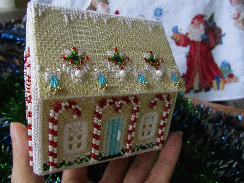 – приклейте домик к подставке и украсьте подставку по периметру пеной.