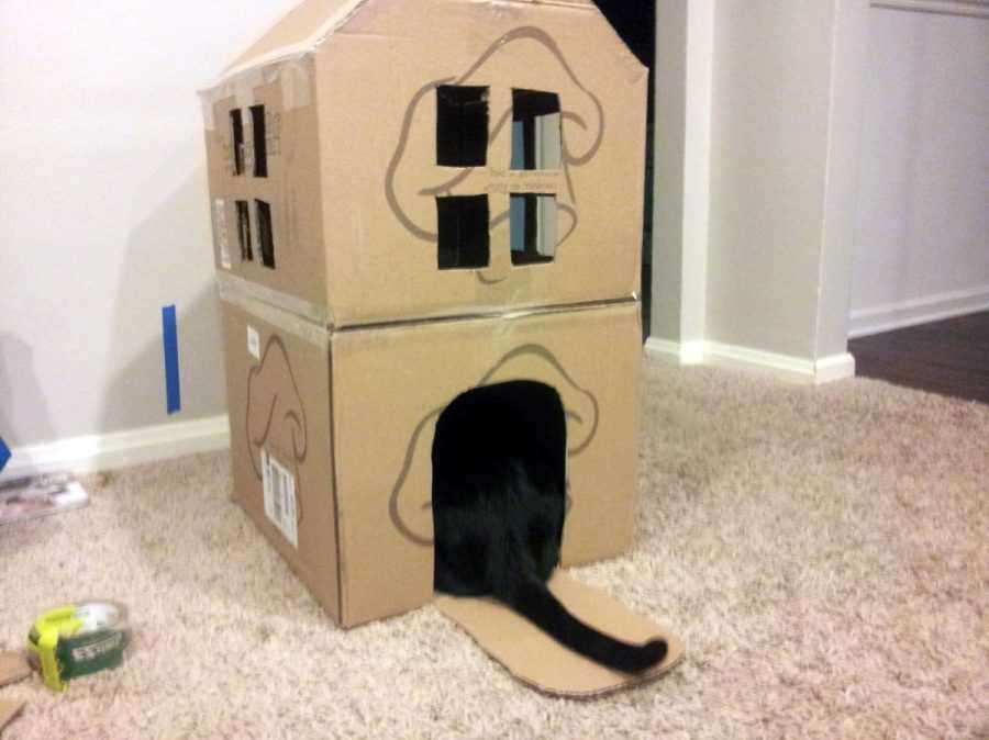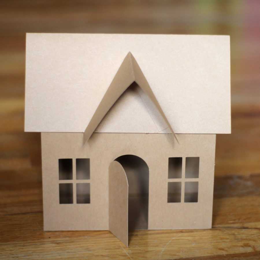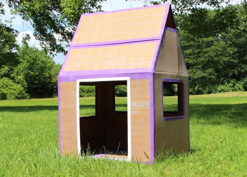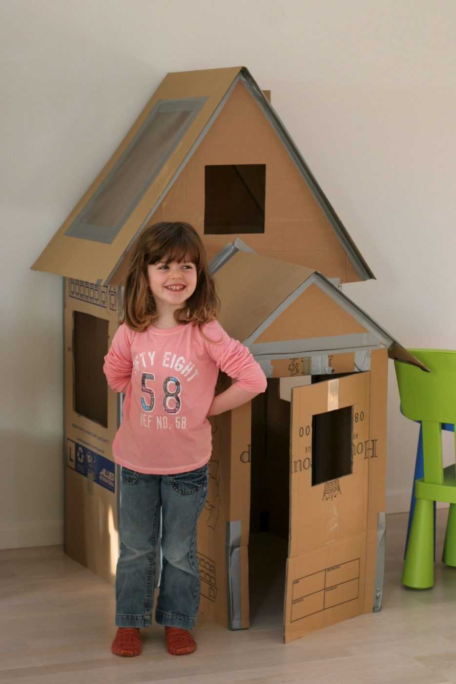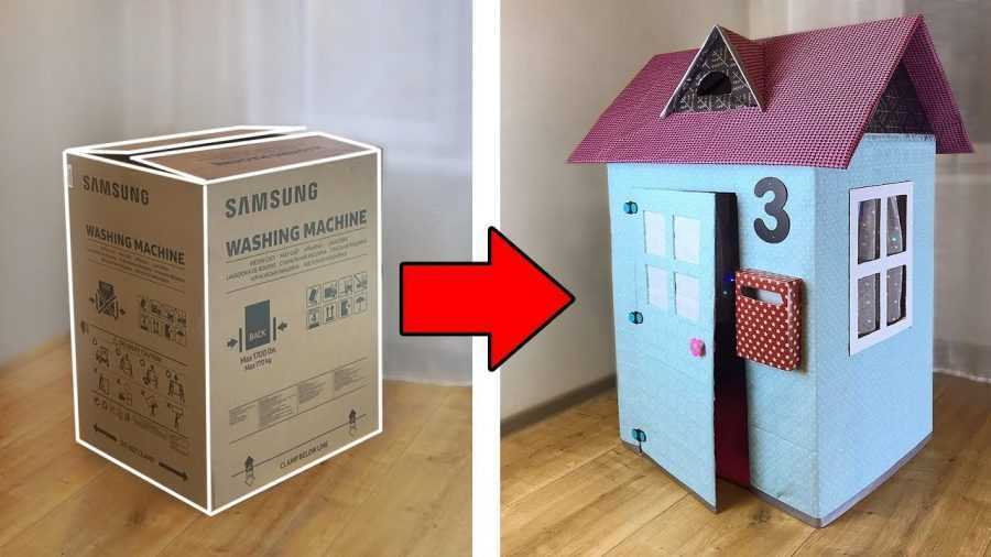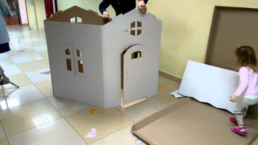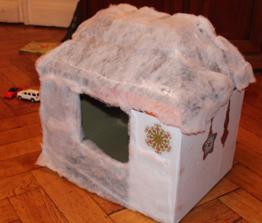 1. Приготовьте картонную коробку и сделайте из нее домик. Вам понадобится разрезать на детали и склеить их.