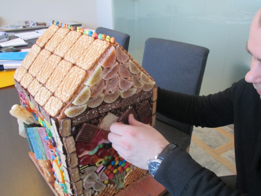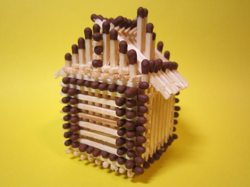 - Собираем домик по той же технологии, как собирают бревенчатые избы. Для крепления используем клей.