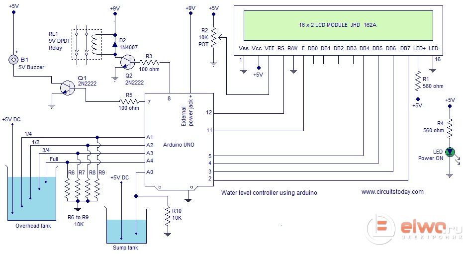Схема уровня воды с помощью контроллера Arduino показано выше. Датчик в сборе состоит из четырех алюминиевых проволок длинной в 1/4, 1/2, 3/4 и полный уровень в баке. Сухие концы этих проводов подключены к аналоговым входам A1, A2, A3 и A4 Arduino соответственно. Пятый провод размещен в нижней части бака. Резисторы R6 — R9 уменьшают потенциал входов. Сухой конец провода подключен к +5V DC. Когда вода касается конкретного зонда, происходит электрическое соединение между зондом и +5V, потому что вода обладает некоторой электропроводностью. В результате ток течет через зонд и этот ток преобразуется в пропорциональное ему напряжение. Arduino читает падении напряжения по каждому из входных резистор для зондирования уровня воды в баке. Транзистор Q1 включает зуммер, резистор R5 ограничивает ток базы Q1. Транзистор Q2 управляет реле. Резистор R3 ограничивает ток базы Q2. Переменник R2 используется для регулировки контрастности ЖК-дисплея. резистор R1 ограничивает ток через его LED подсветку. Резистор R4 ограничивает ток через светодиодный индикатор питания. Полную программу для контроллера на Arduino можно загрузить тут.