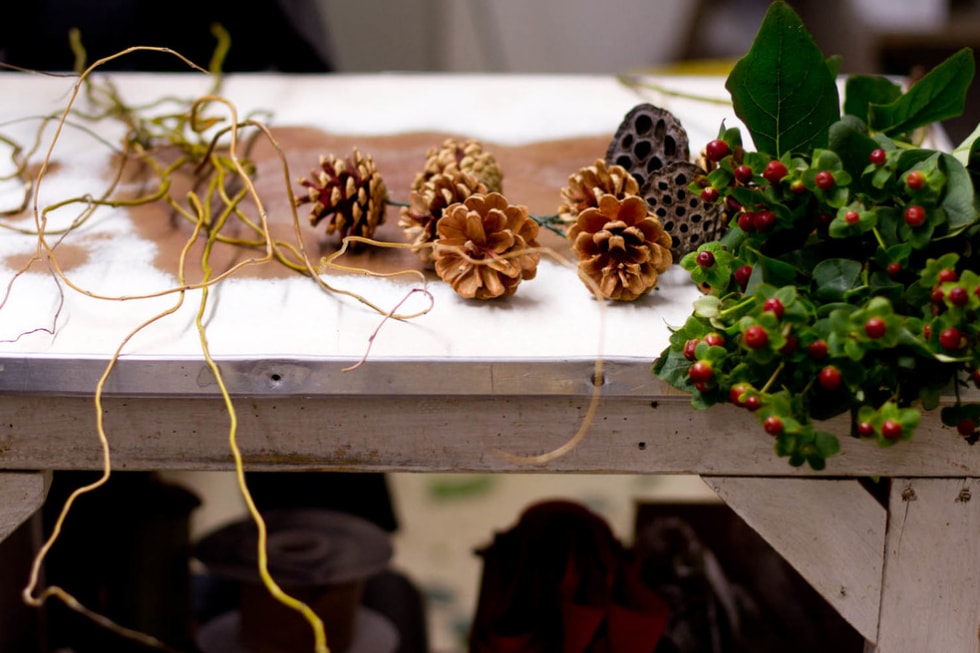 Добавляем в композицию семенные коробочки лотоса и ветки зверобоя.