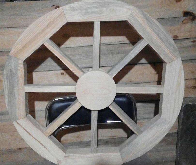 Получившийся круг нужно разделить на восемь равных кусочков. На ободе можно увидеть столько же равных сегментов. Под них вырезают брусочки 30х80 с длиной, соответствующей каждому отрезку обода. Их торцы должны быть подпилены для удобного соединения между собой в форме восьмиугольника. Проверьте качество стыковки.