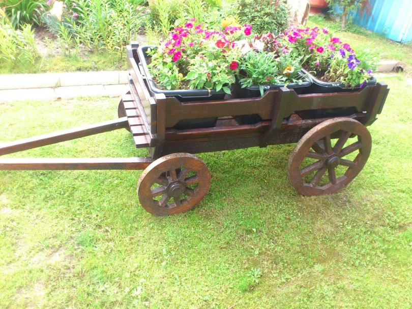 Вместо ящиков можно приобрести красивые горшки, которые размещают по периметру декоративной повозки. В горшки можно высадить как привычные сорта растений, так и экзотические оригинальные цветы.