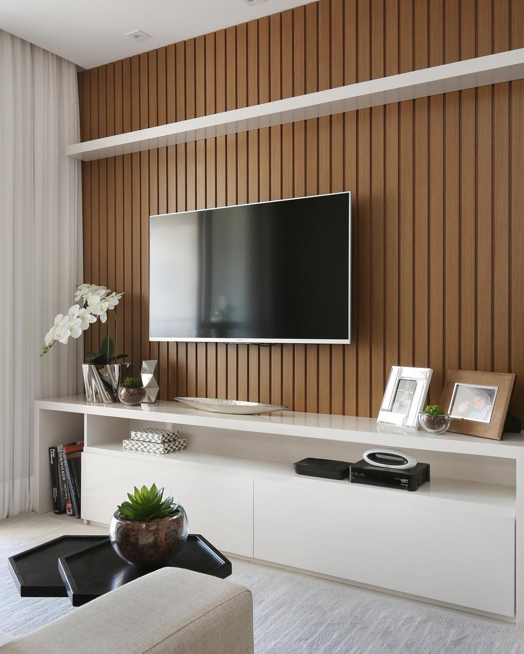 Рис. 5. Современная стенка для ТВ с экраном из тёмных деревянных реек |